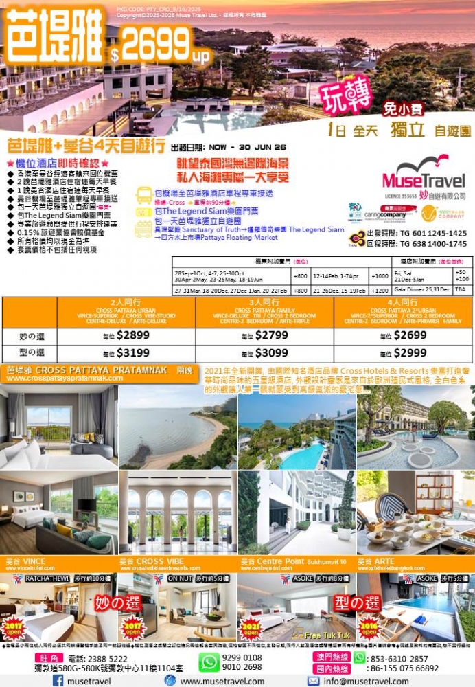 眺望泰國灣無邊際海景 私人海灘專屬一大享受 深度自遊團 價格 $2699 套票詳細資料 接送有所提供 Facebook分享 ◆ 香港至曼谷經濟客艙來回位機票 ◆ 2 晚芭堤雅酒店住宿連每天早餐 ◆ 1 晚曼谷酒店住宿連每天早餐 ◆ 曼谷機場至芭堤雅單程專車接送 ◆ 包一天芭堤雅獨立自遊團*專車* ◆ 包The Legend Siam樂園門票 ◆ 專業旅遊顧問提供行程安排建議 ◆ 0.15% 旅遊業協會賠償基金 ◆ 所有格價均以現金為準 ◆ 套票價格不包括任何稅項
