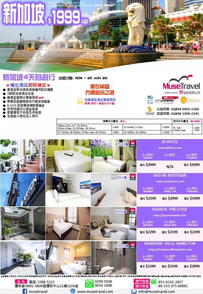 ◆ 3晚新加坡酒店住宿