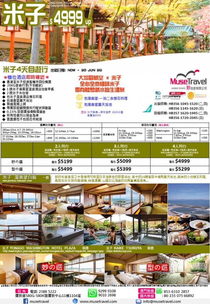 ◆ 香港至米子經濟客艙來回位機票