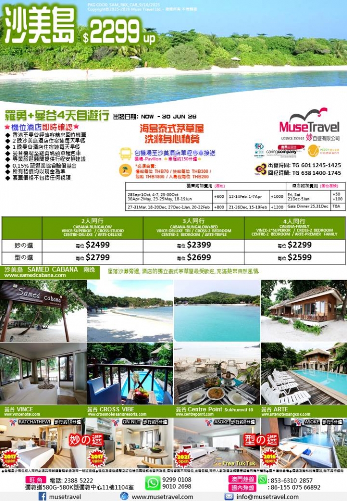 ◆ 2 晚沙美島酒店住宿連每天早餐
