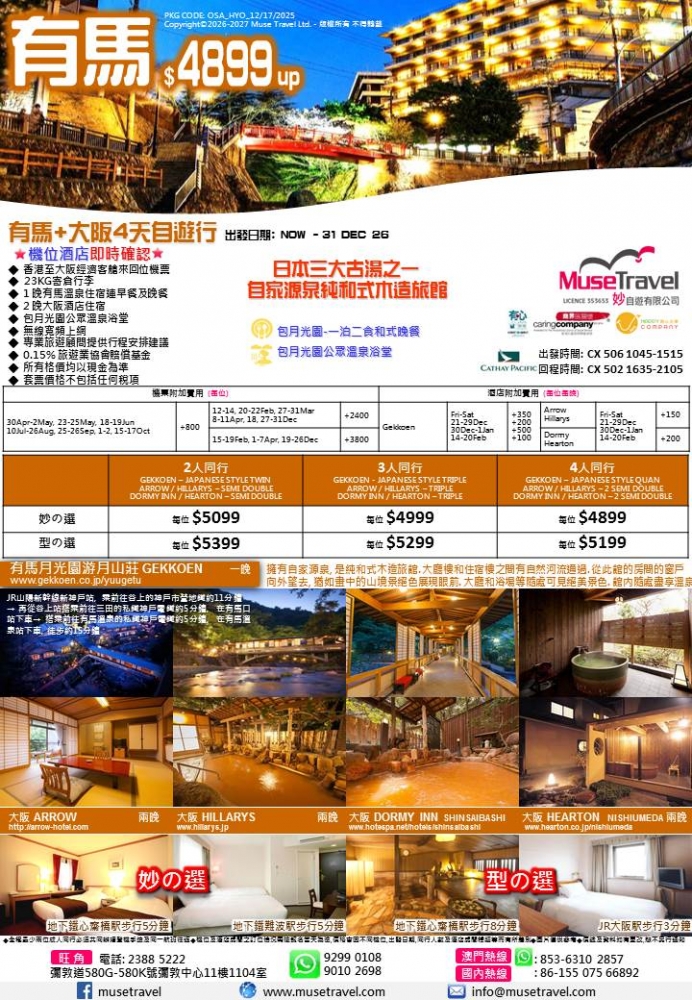 ◆ 1 晚有馬溫泉住宿連早餐及晚餐
