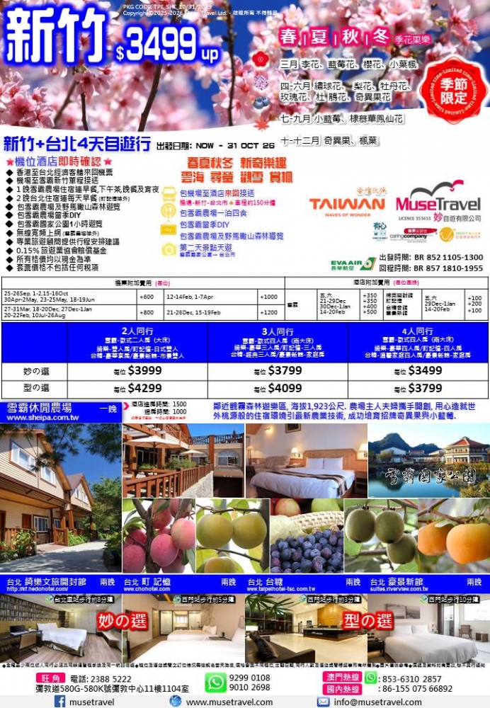 採果-春夏秋冬 新奇樂趣 尋螢 採果 觀雪 賞楓 價格 $3499 套票詳細資料 接送有所提供 Facebook分享 ◆ 香港至台北經濟客艙來回機票 ◆ 機場至雪霸新竹單程接送 ◆ 1 晚雪霸農場住宿連早餐,下午茶,晚餐及宵夜 ◆ 2 晚台北住宿連每天早餐 (町記憶除外) ◆ 包雪霸農場及野馬瞰山森林遊覽 ◆ 包雪霸農場當季DIY ◆ 包雪霸國家公園1小時遊覽 ◆ 無線寬頻上網 (雪霸農場除外) ◆ 專業旅遊顧問提供行程安排建議 ◆ 0.15% 旅遊業協會賠償基金 ◆ 所有格價均以現金為準 ◆ 套票價格不包括任何稅項