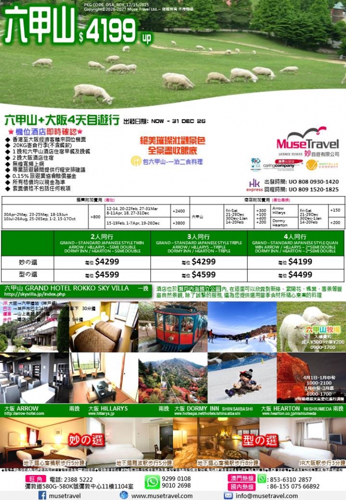 ◆ 1 晚和六甲山酒店住宿早餐及晚餐