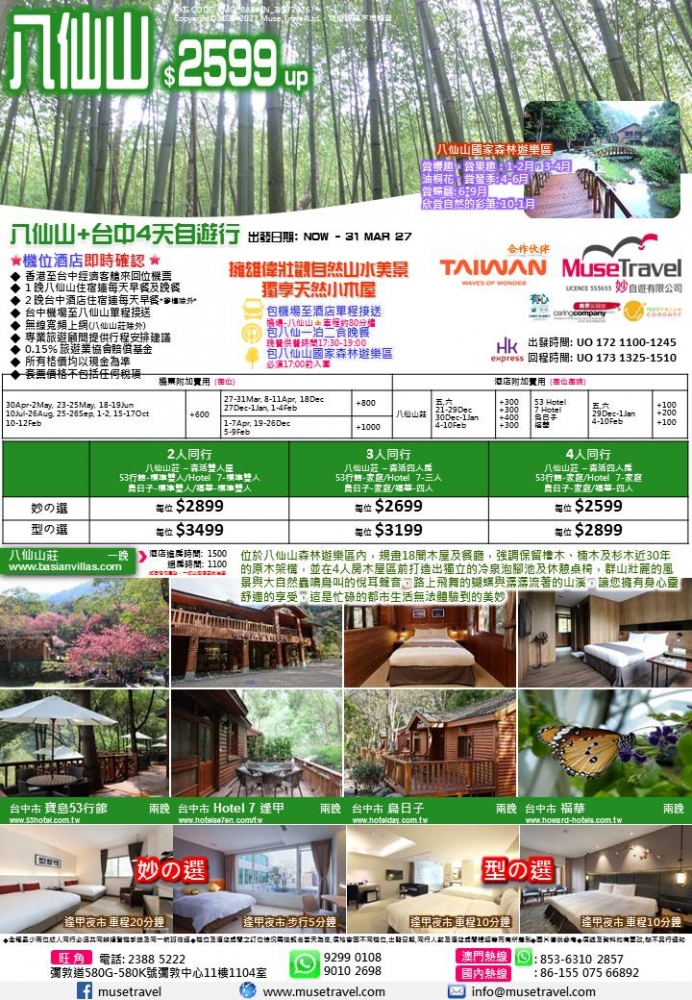 ◆ 1 晚八仙山住宿連每天早餐及晚餐