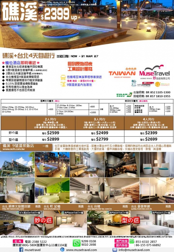 ◆ 1晚9號溫泉住宿連早餐 (入住時間1800)