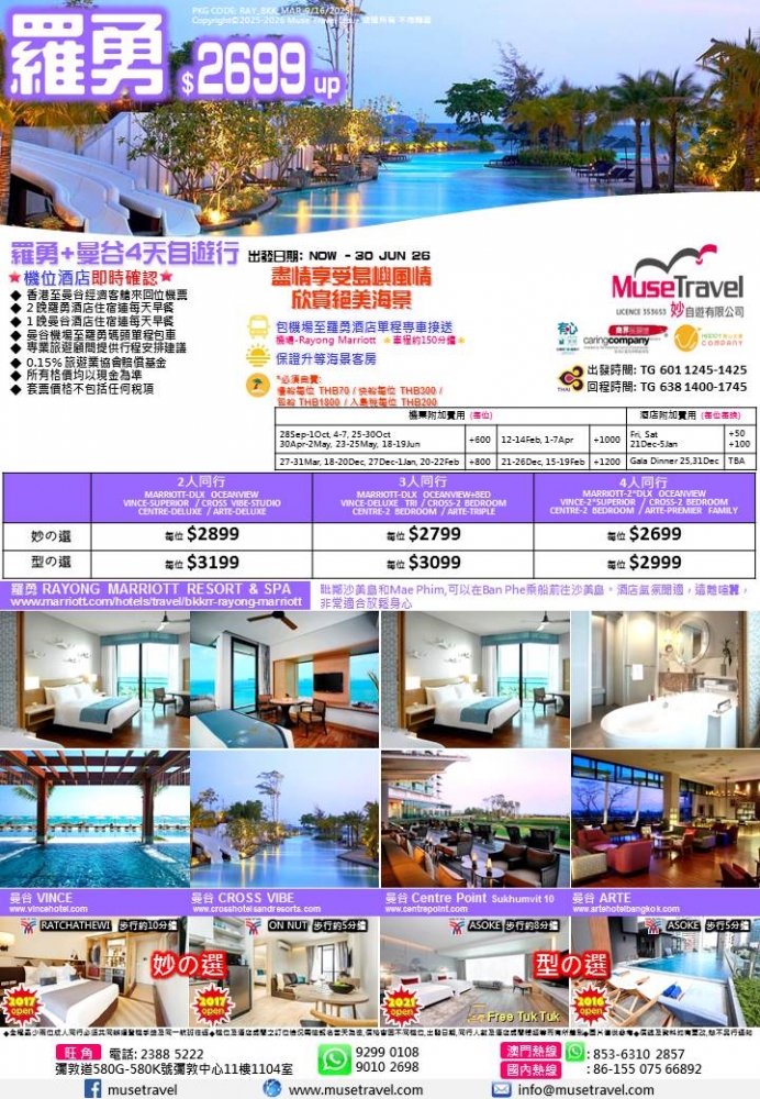 ◆ 2 晚羅勇酒店住宿連每天早餐