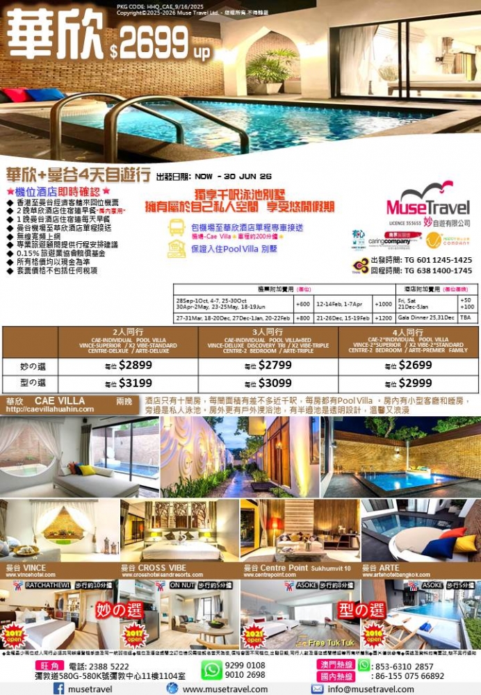 ◆ 2 晚華欣酒店住宿連早餐*房內享用*