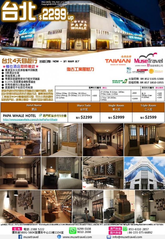 西門町-復古工業風魅力 價格 $2299 套票詳細資料 接送暫未提供 Facebook分享 ◆ 香港至台北經濟客艙來回機票 ◆ 3晚酒店住宿 ◆ 無線寬頻上網 ◆ 專業旅遊顧問提供行程安排建議 ◆ 0.15% 旅遊業協會賠償基金 ◆ 所有格價均以現金為準 ◆ 套票價格不包括任何稅項