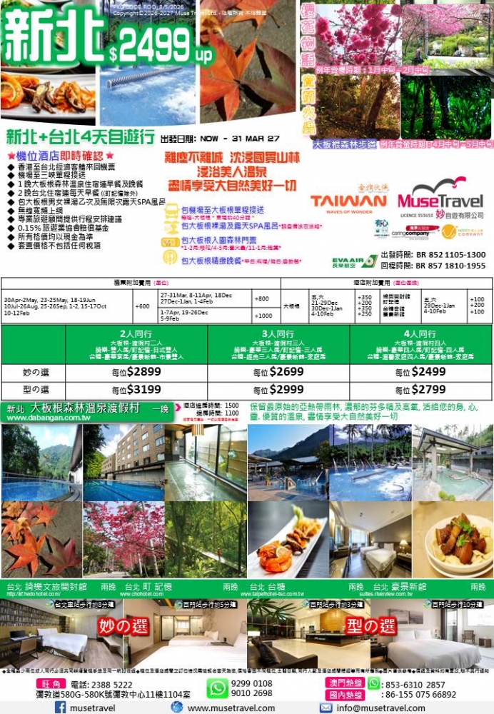 ◆ 2 晚台北住宿連每天早餐 (町記憶除外)