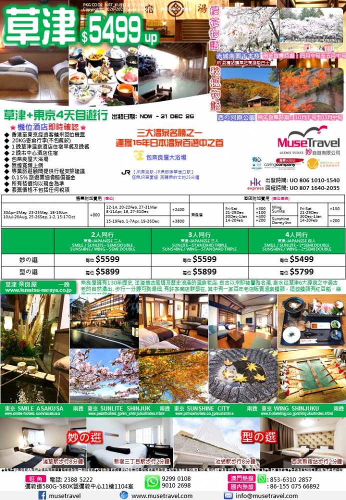 ◆ 1 晚草津溫泉酒店住宿早餐及晚餐
