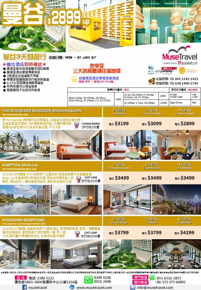 ◆ 香港至曼谷經濟客艙來回位機票