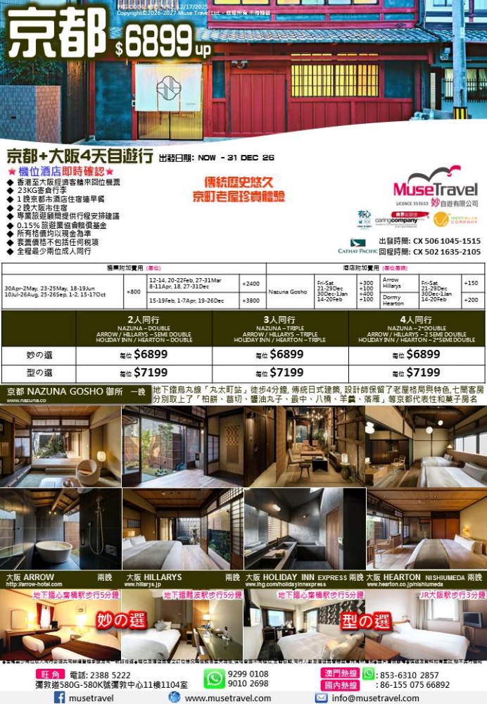 ◆ 1 晚京都市酒店住宿連早餐