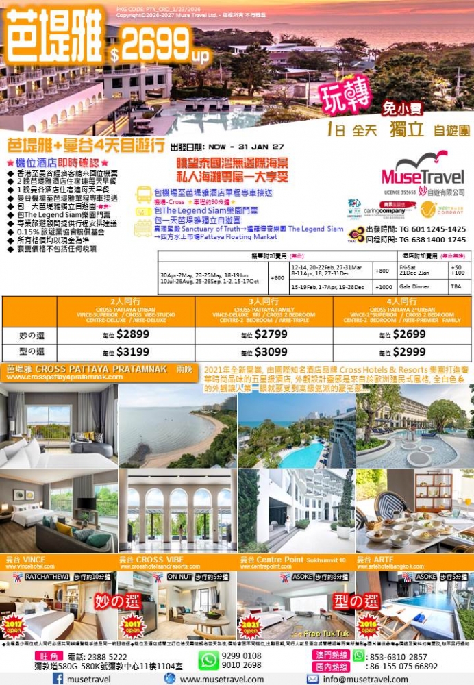 眺望泰國灣無邊際海景 私人海灘專屬一大享受 深度自遊團 價格 $2699 套票詳細資料 接送有所提供 Facebook分享 ◆ 香港至曼谷經濟客艙來回位機票 ◆ 2 晚芭堤雅酒店住宿連每天早餐 ◆ 1 晚曼谷酒店住宿連每天早餐 ◆ 曼谷機場至芭堤雅單程專車接送 ◆ 包一天芭堤雅獨立自遊團*專車* ◆ 包The Legend Siam樂園門票 ◆ 專業旅遊顧問提供行程安排建議 ◆ 0.15% 旅遊業協會賠償基金 ◆ 所有格價均以現金為準 ◆ 套票價格不包括任何稅項