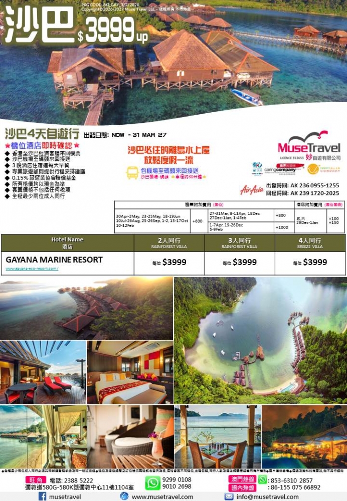 ◆ 香港至沙巴經濟客艙來回機票