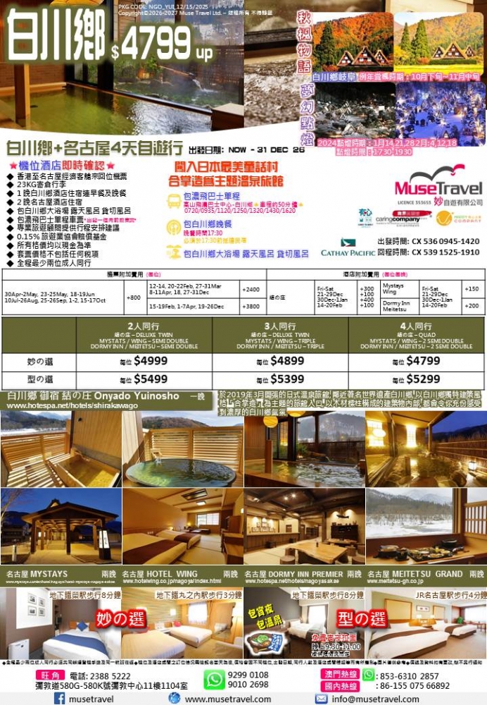 ◆ 1 晚白川鄉酒店住宿連早餐及晚餐