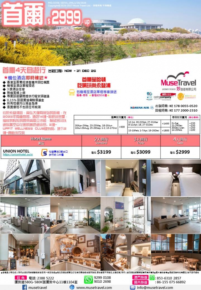 ◆ 香港至首爾經濟客艙來回位機票