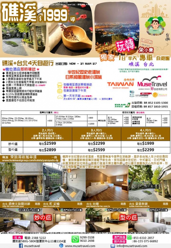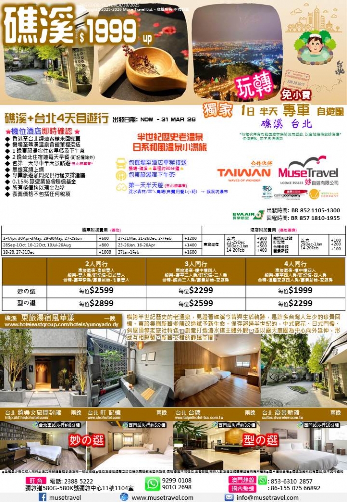 ◆ 2 晚台北住宿連每天早餐 (町記憶除外)