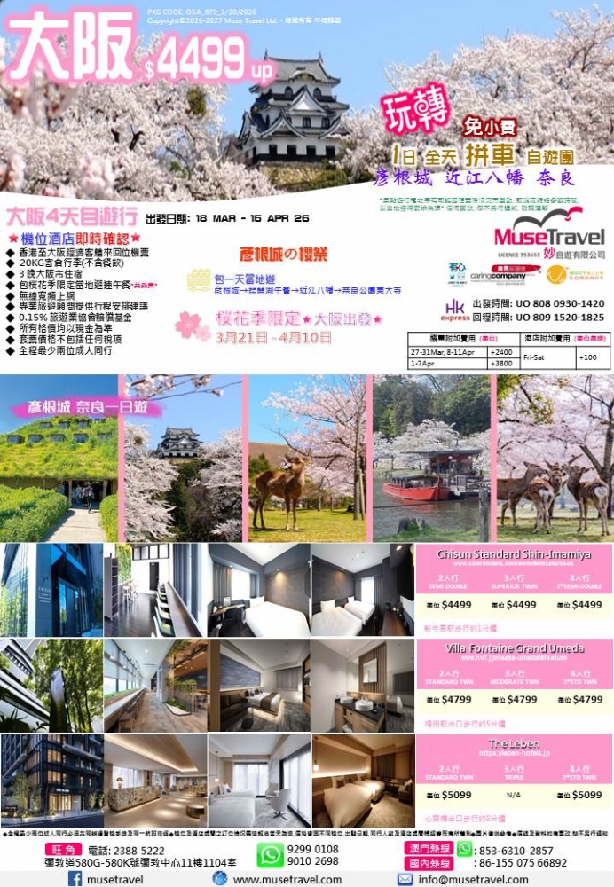 ◆ 3 晚大阪市住宿