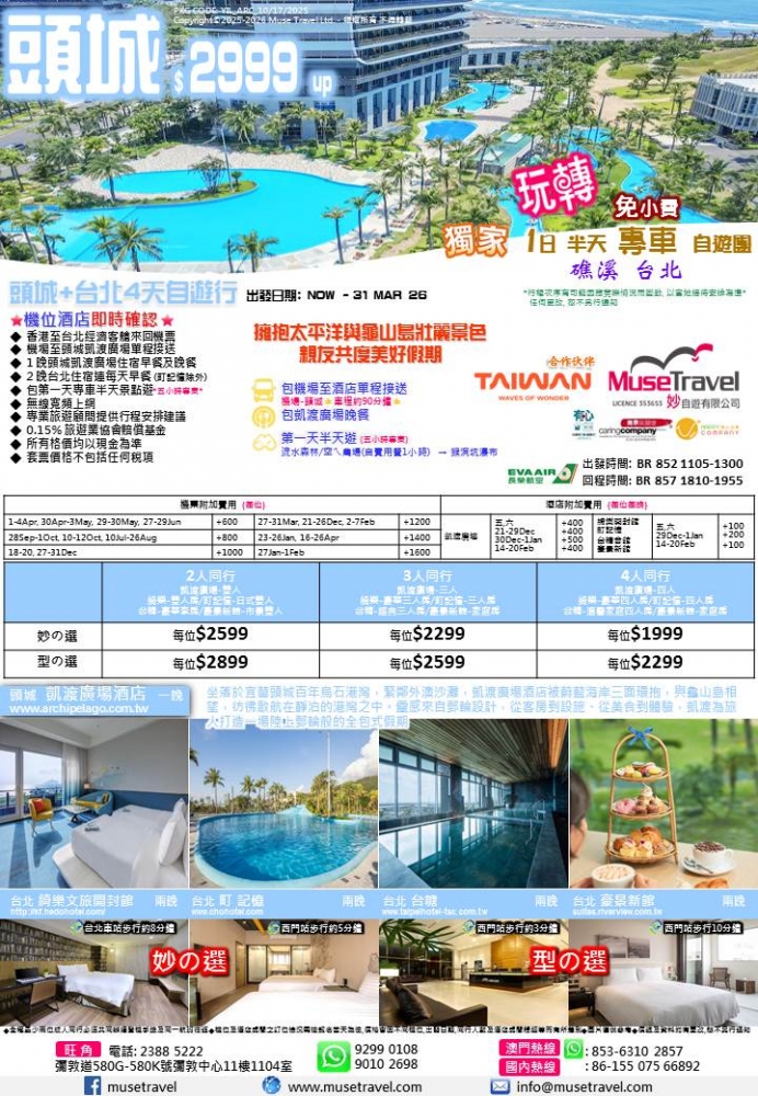 ◆ 2 晚台北住宿連每天早餐 (町記憶除外)
