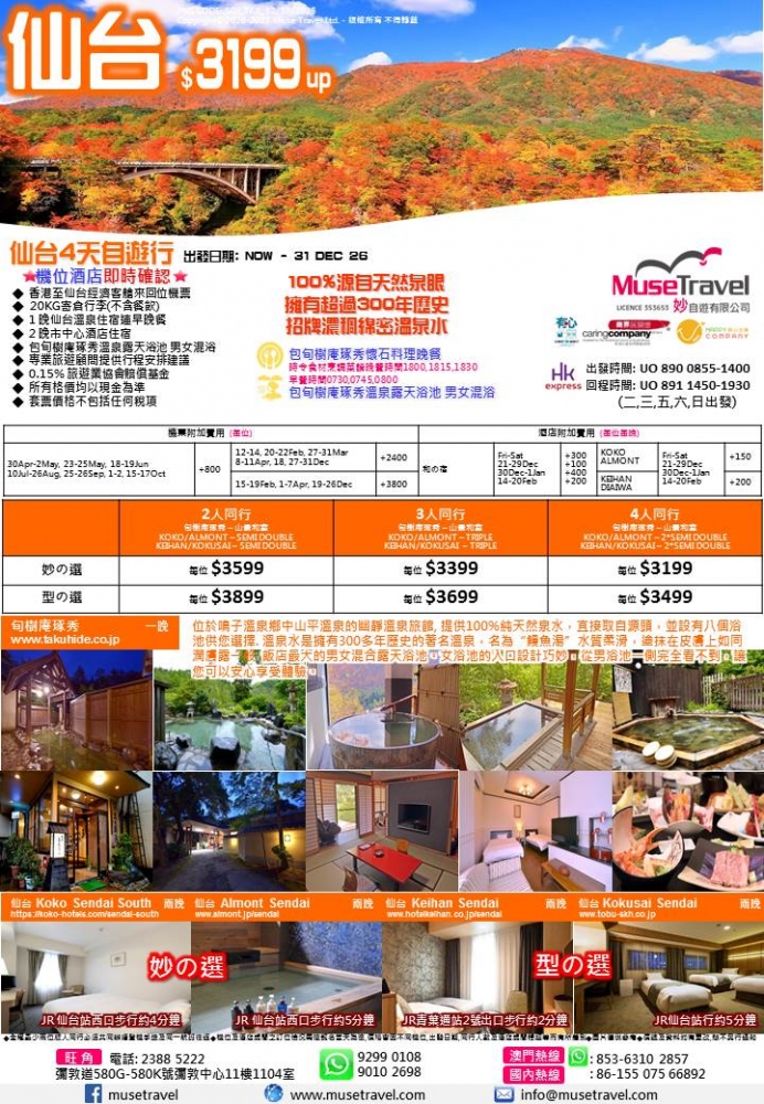 ◆ 香港至仙台經濟客艙來回位機票