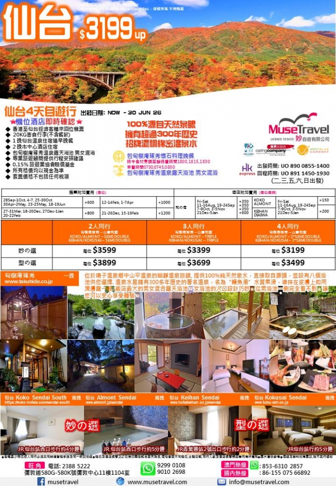 ◆ 香港至仙台經濟客艙來回位機票