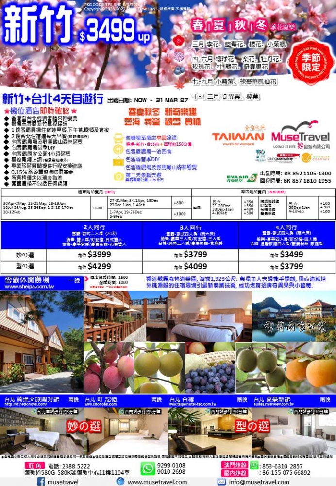 採果-春夏秋冬 新奇樂趣 尋螢 採果 觀雪 賞楓 價格 $3499 套票詳細資料 接送有所提供 Facebook分享 ◆ 香港至台北經濟客艙來回機票 ◆ 機場至雪霸新竹單程接送 ◆ 1 晚雪霸農場住宿連早餐,下午茶,晚餐及宵夜 ◆ 2 晚台北住宿連每天早餐 (町記憶除外) ◆ 包雪霸農場及野馬瞰山森林遊覽 ◆ 包雪霸農場當季DIY ◆ 包雪霸國家公園1小時遊覽 ◆ 無線寬頻上網 (雪霸農場除外) ◆ 專業旅遊顧問提供行程安排建議 ◆ 0.15% 旅遊業協會賠償基金 ◆ 所有格價均以現金為準 ◆ 套票價格不包括任何稅項