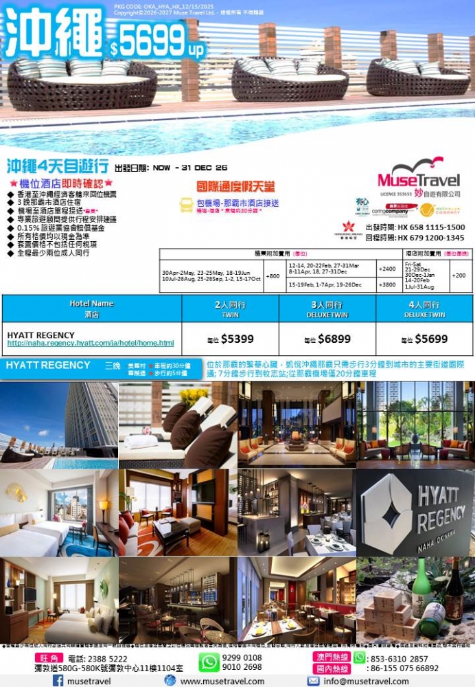 那霸市-國際通度假天堂 價格 $5699 套票詳細資料 接送暫未提供 Facebook分享 ◆ 香港至沖繩經濟客艙來回位機票 ◆ 3 晚那霸市酒店住宿 ◆ 機場至酒店單程接送*專車* ◆ 0.15% 旅遊業協會賠償基金 ◆ 所有格價均以現金為準 ◆ 套票價格不包括任何稅項 ◆ 全程最少兩位成人同行