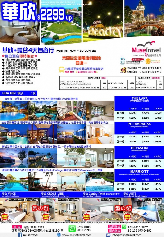 ◆ 2 晚華欣酒店住宿連每天早餐