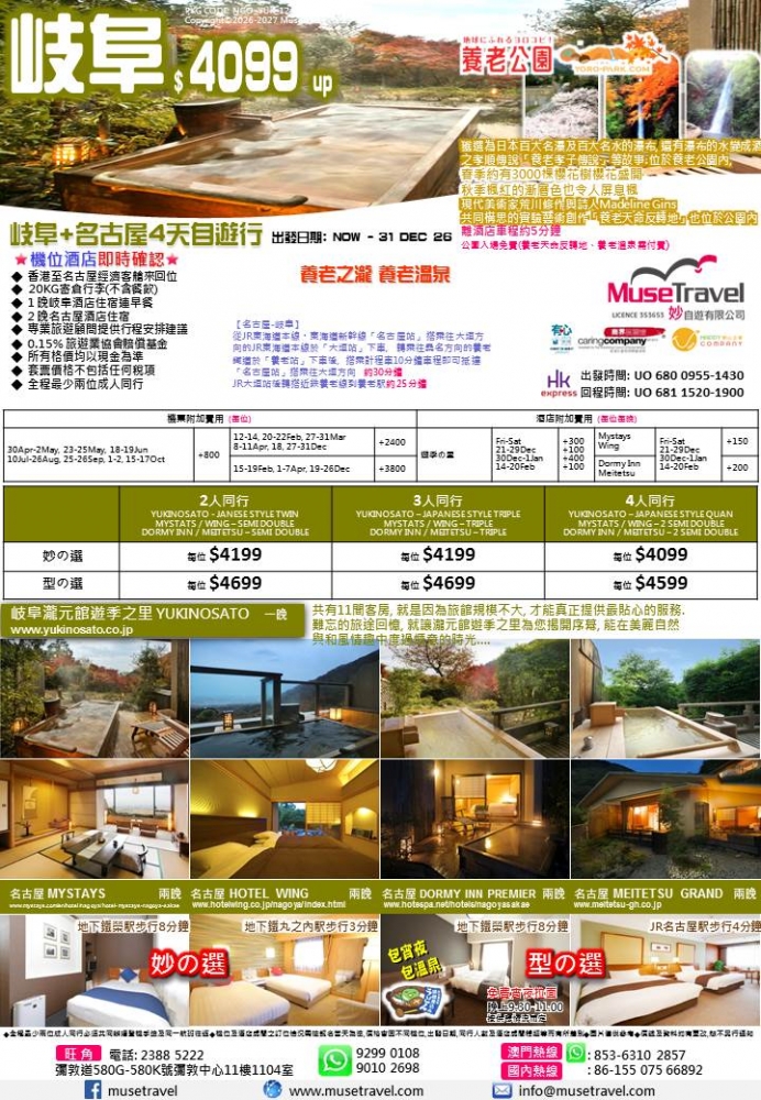 ◆ 1 晚岐阜酒店住宿連早餐
