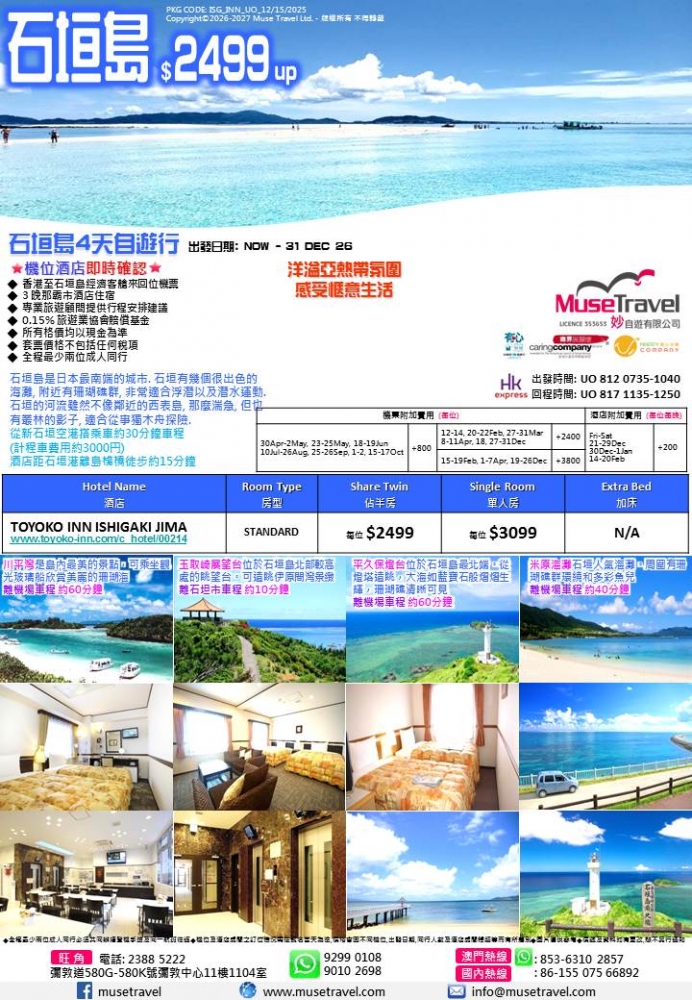 洋溢亞熱帶氛圍 感受愜意生活 價格 $2499 套票詳細資料 接送暫未提供 Facebook分享 ◆ 香港至石垣島經濟客艙來回位機票 ◆ 3 晚石垣島酒店住宿 ◆ 0.15% 旅遊業協會賠償基金 ◆ 所有格價均以現金為準 ◆ 套票價格不包括任何稅項 ◆ 全程最少兩位成人同行