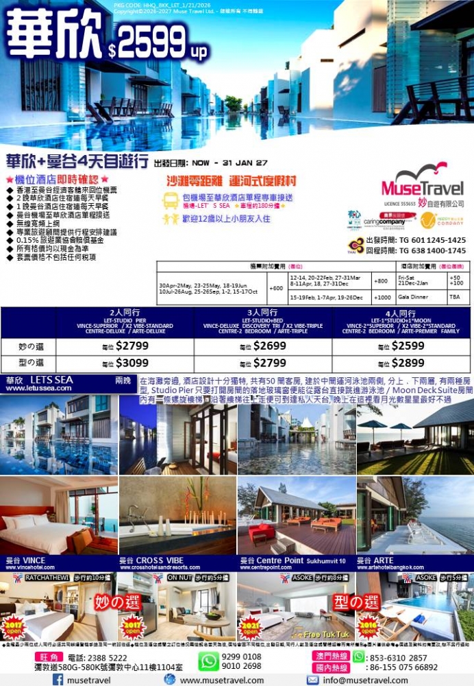 ◆ 2 晚華欣酒店住宿連每天早餐