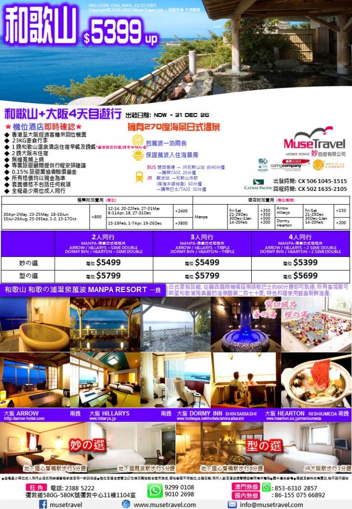 ◆ 1 晚和歌山溫泉酒店住宿早餐及晚餐*當季懷石料理/時令海鮮料理*