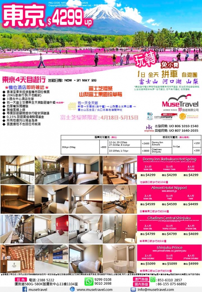 東京-富士芝櫻祭 山梨富士果園採草莓 價格 $4299 套票詳細資料 接送有所提供 Facebook分享 ◆ 香港至東京經濟客艙來回位機票 ◆ 20KG寄倉行李(不包餐飲) ◆ 3 晚市中心酒店住宿 ◆ 包一天富士芝櫻祭全天景點遊連午餐*共乘車* ◆ 包草莓採摘體驗 ◆ 無線寬頻上網 ◆ 專業旅遊顧問提供行程安排建議 ◆ 0.15% 旅遊業協會賠償基金 ◆ 所有格價均以現金為準 ◆ 套票價格不包括任何稅項