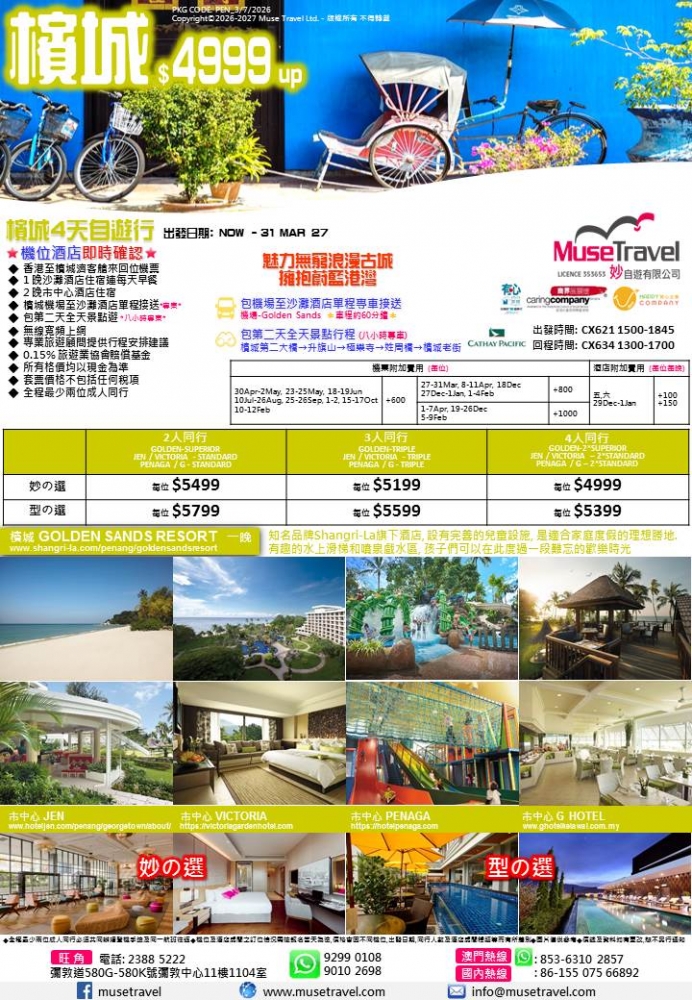 ◆ 香港至檳城濟客艙來回位機票
